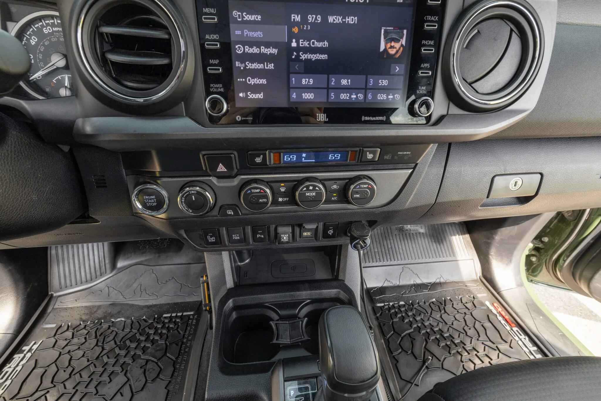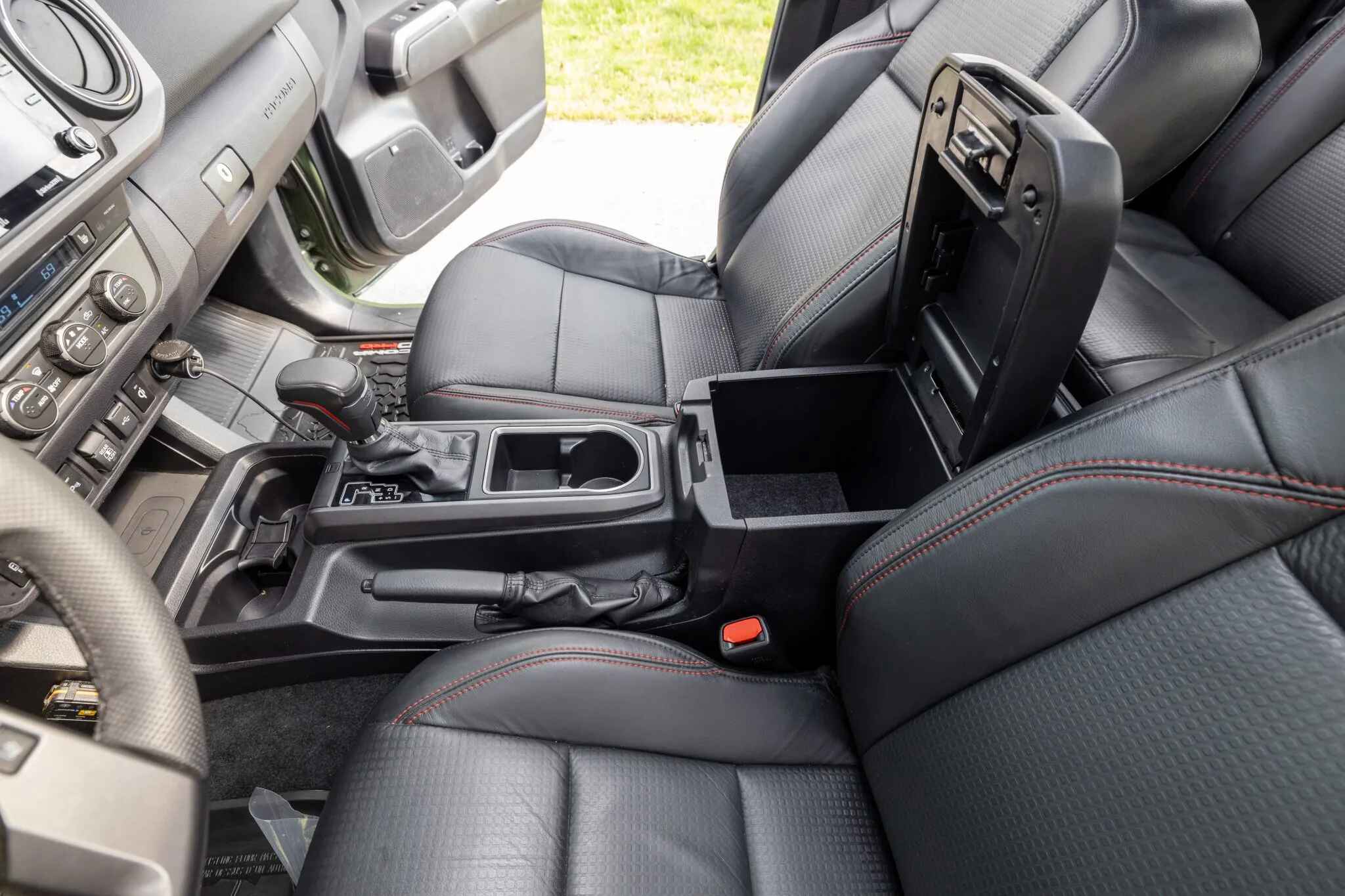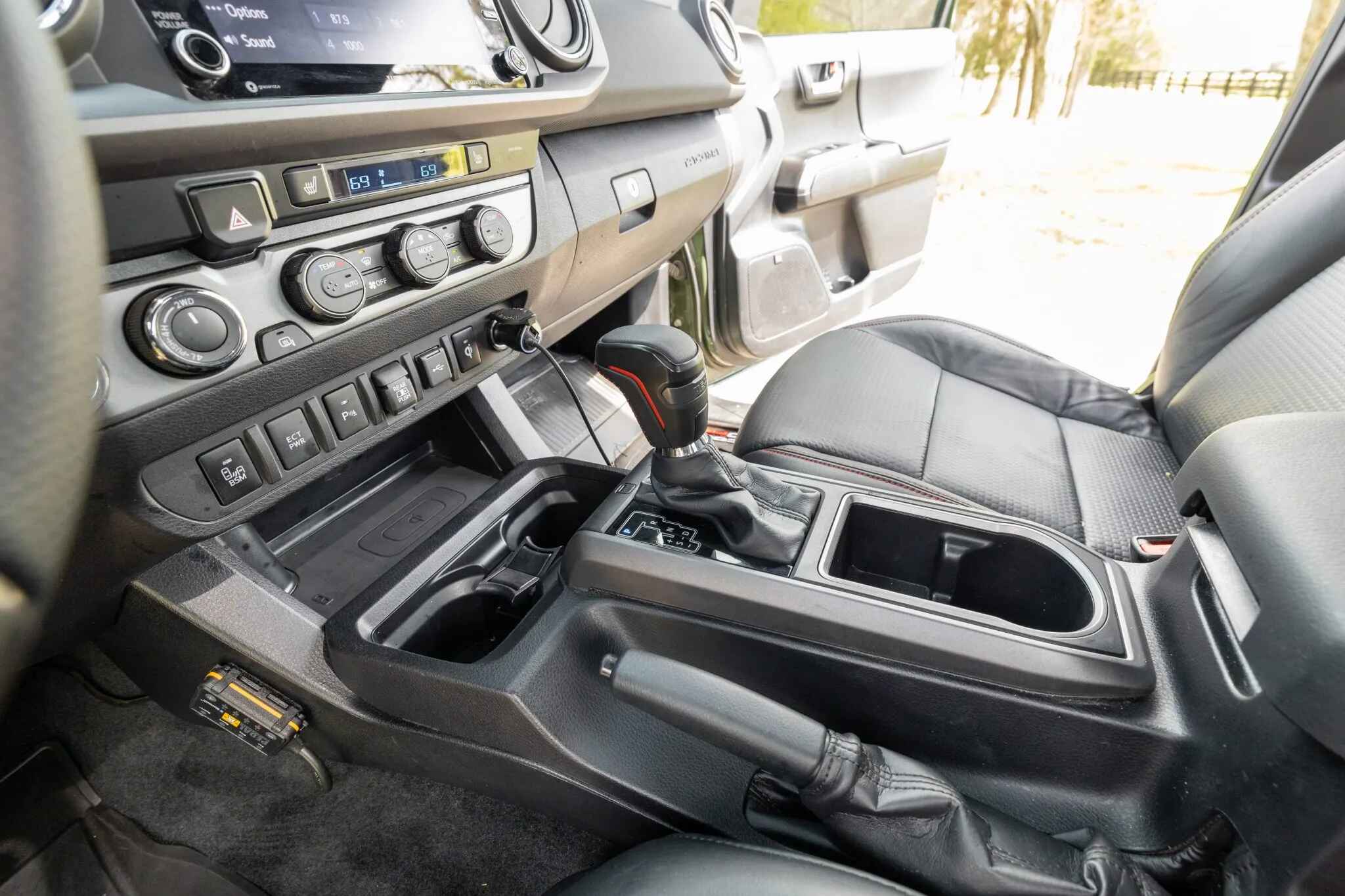 The heated front seats and rear bench are trimmed in black leather upholstery with contrasting stitching. Amenities include a Pedal Commander, dual-zone automatic climate control, a wireless charging pad, a powered sliding rear window, Tacoma-branded floor mats, and a JBL touchscreen infotainment system with a CD player.