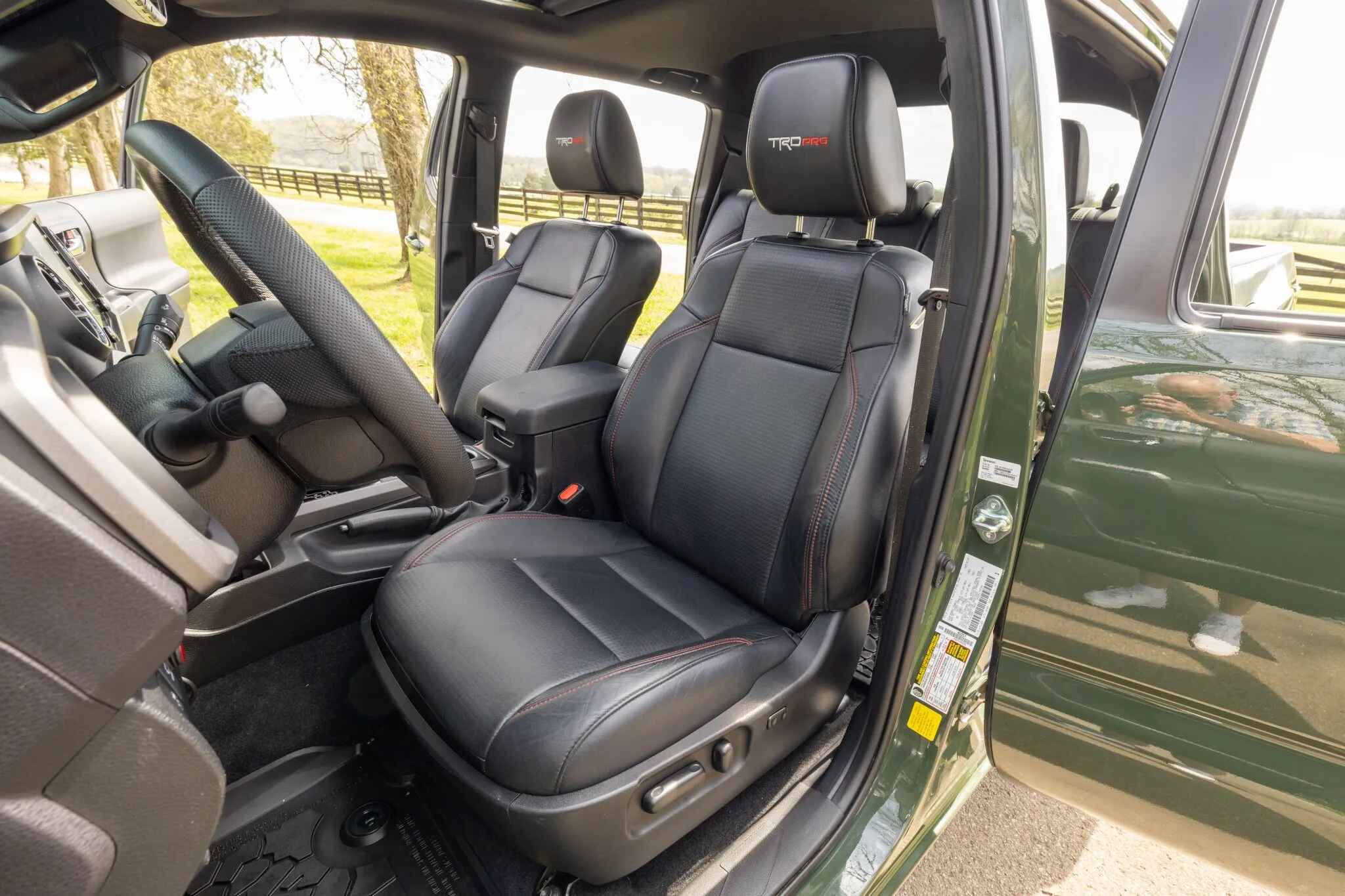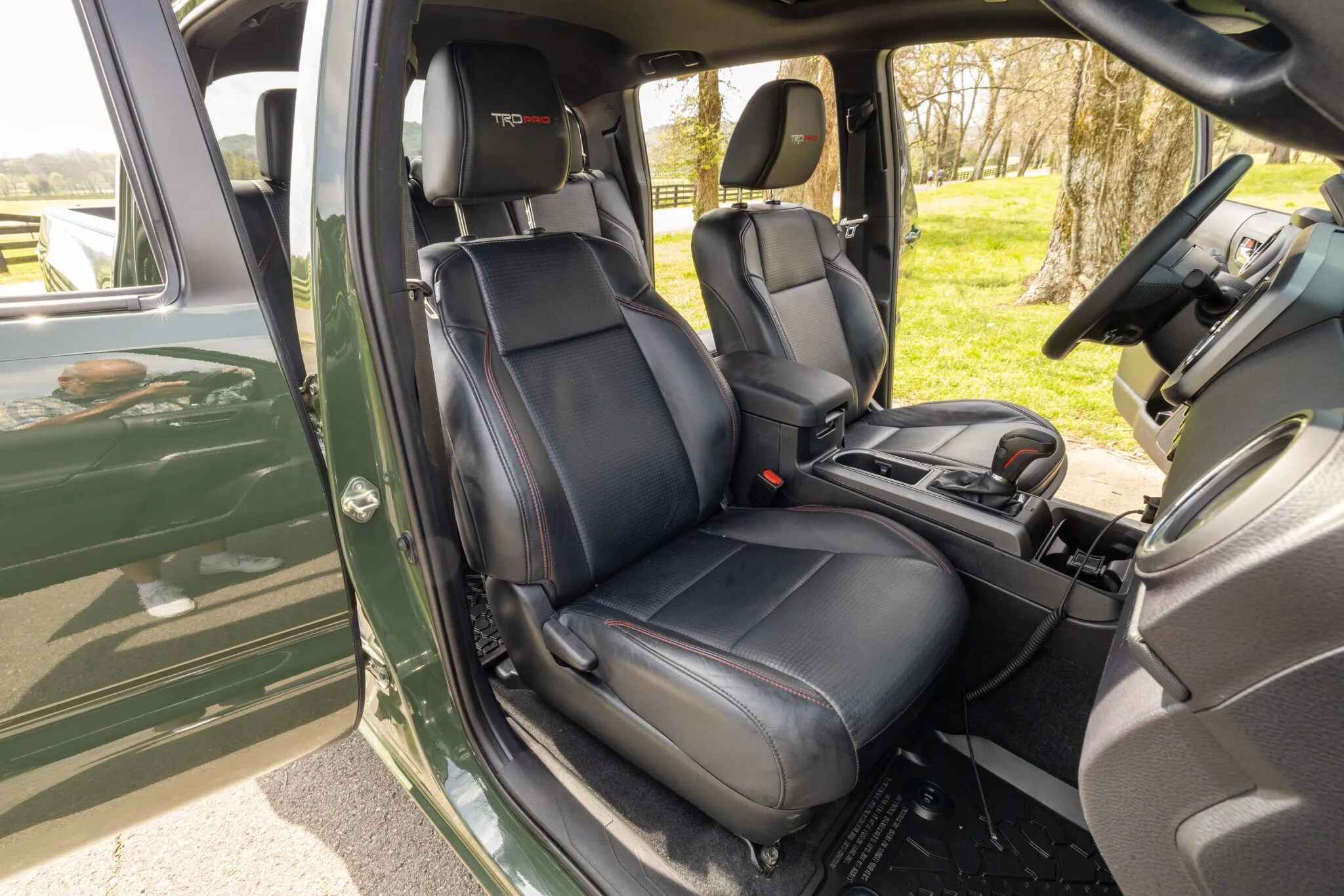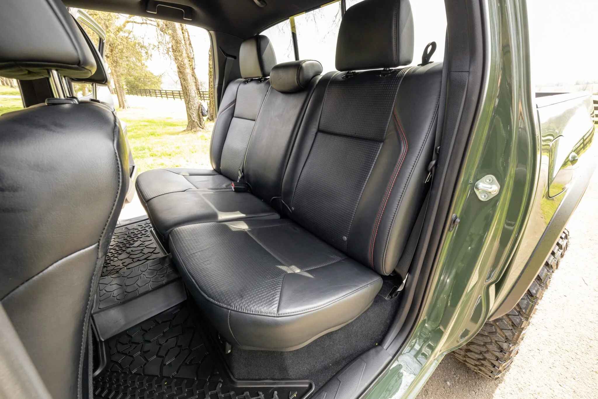 The heated front seats and rear bench are trimmed in black leather upholstery with contrasting stitching. Amenities include a Pedal Commander, dual-zone automatic climate control, a wireless charging pad, a powered sliding rear window, Tacoma-branded floor mats, and a JBL touchscreen infotainment system with a CD player.
