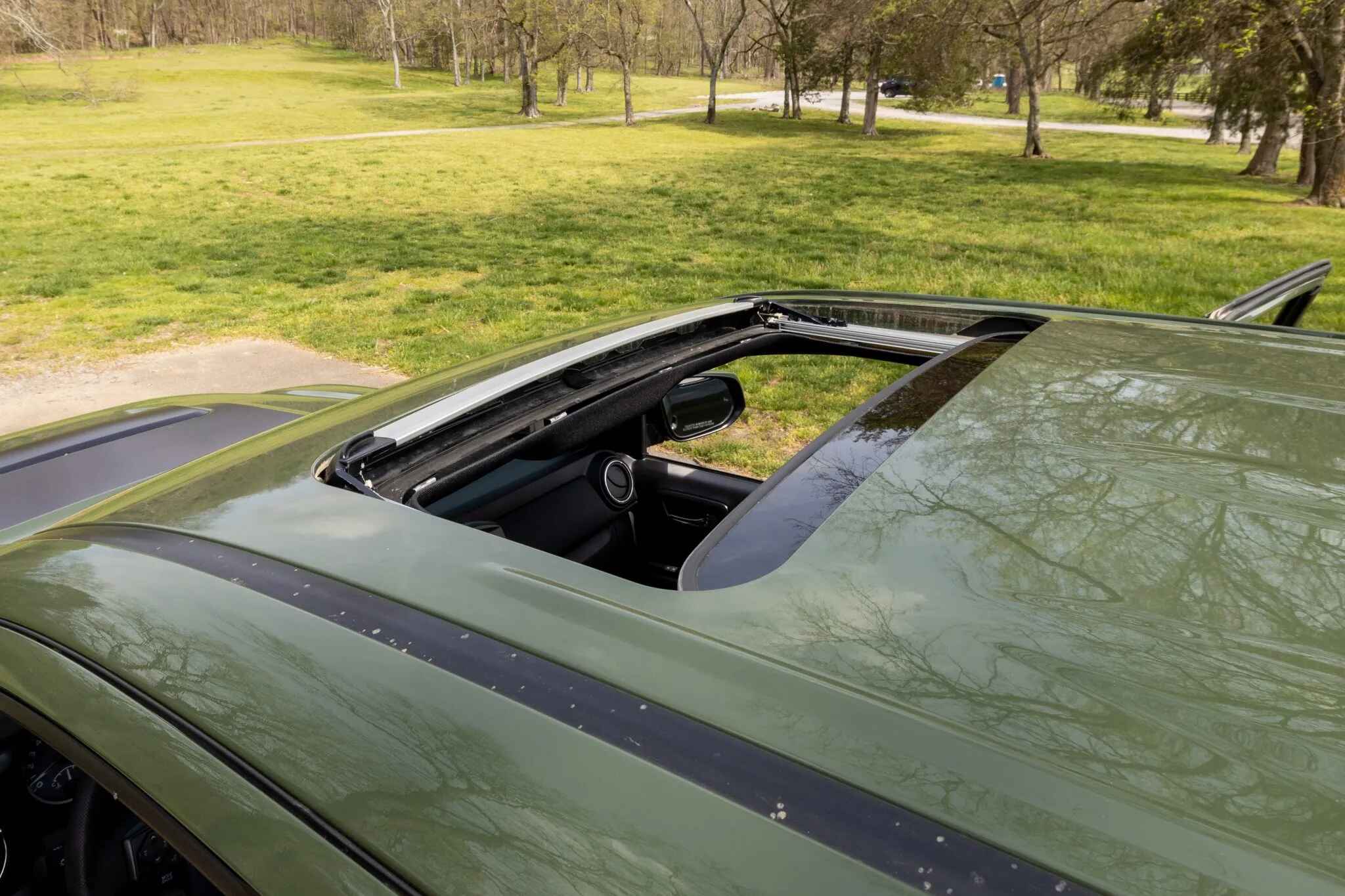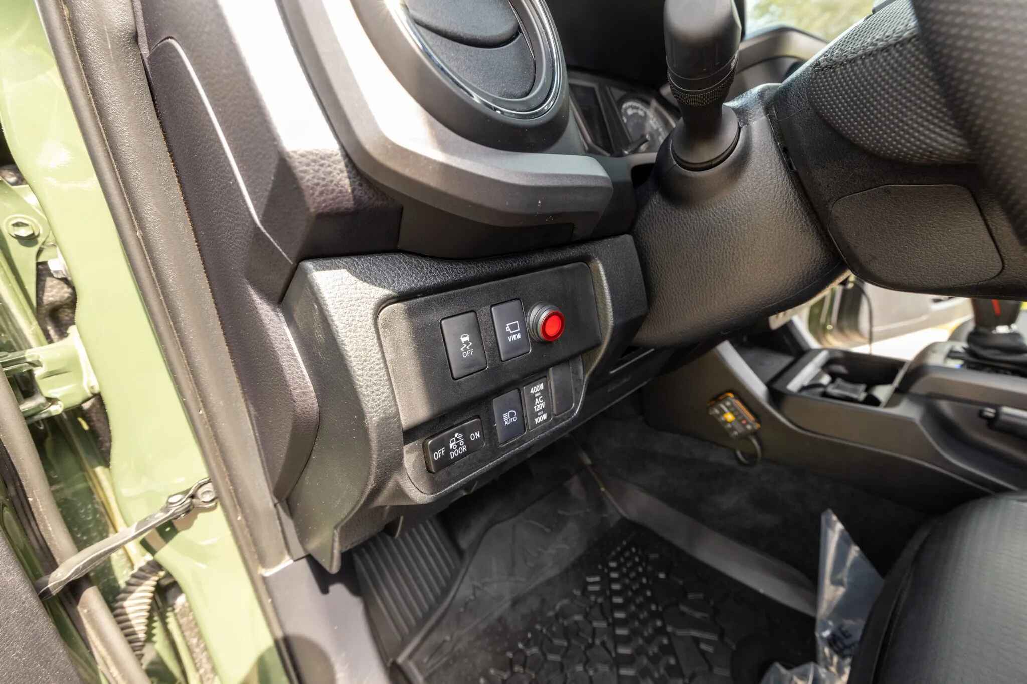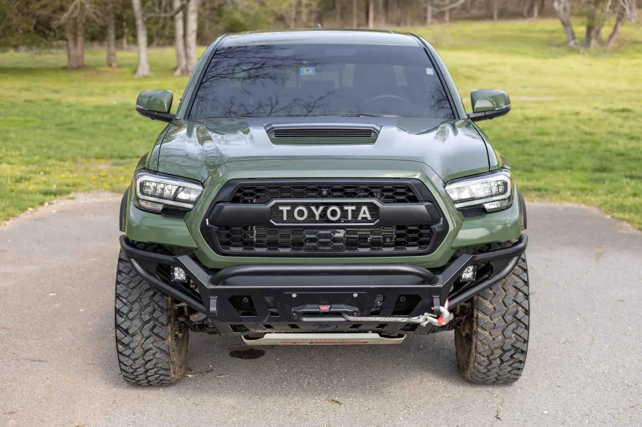 The truck is finished in Army Green (6V7) and is equipped with an aftermarket front bumper with a Warn winch as well as a hood scoop, a sunroof, LED headlights, Rigid fog lights, and a receiver hitch. The rear cargo area features tailgate protection and a 120-volt power outlet.