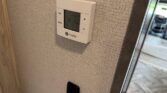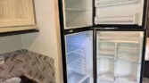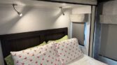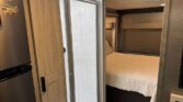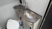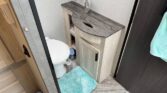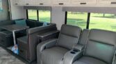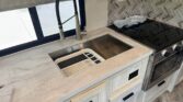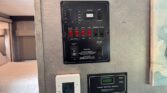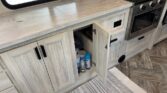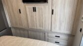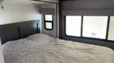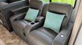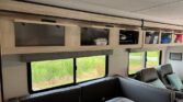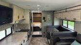 In the rear, the private master suite features a walk-around queen bed, dual wardrobes, and a 12V bedroom TV. The bathroom offers a 24″ x 32″ shower with a skylight, an oxygen-infused shower head, and an electric roof fan for ventilation. Heated, enclosed tanks and a water filtration system make this coach four-season friendly.