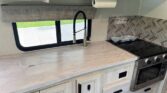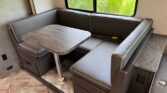 The living area features a comfortable set of recliners, a convertible U-dinette, and a 32″ 12V LED TV — perfect for winding down after a day of exploring. The cab-over bunk offers extra sleeping space, or opt for the Trekker cap with a built-in entertainment center for a streamlined look.