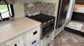 The fully equipped kitchen is ready for anything from quick snacks to gourmet meals, with upgraded appliances including a recessed 3-burner range with flush glass cover, a 1.3 cu. ft. stainless steel convection microwave, and a spacious 10.7 cu. ft. 12V refrigerator. Soft-touch self-closing drawers and a flip-up counter extension make cooking and cleanup easy.